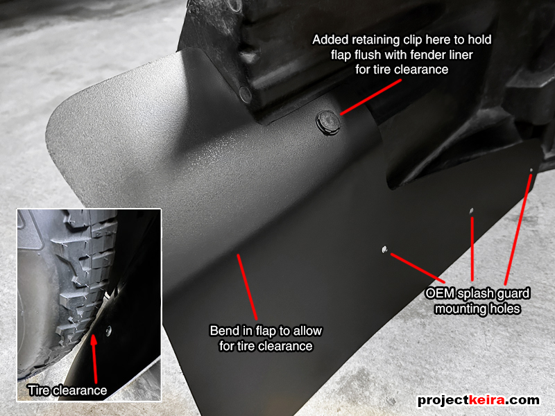 My solution was to add a soft vertical bend to the front flap. This would move the inner portion of the flap away from the tire. To, keep the bend in place, I kept it really simple and just used an OEM-style plastic pop clip. The pop clip ended up being an easy but secure and very effective solution for holding the inner part of the Rally Armor flap away from the tire area: