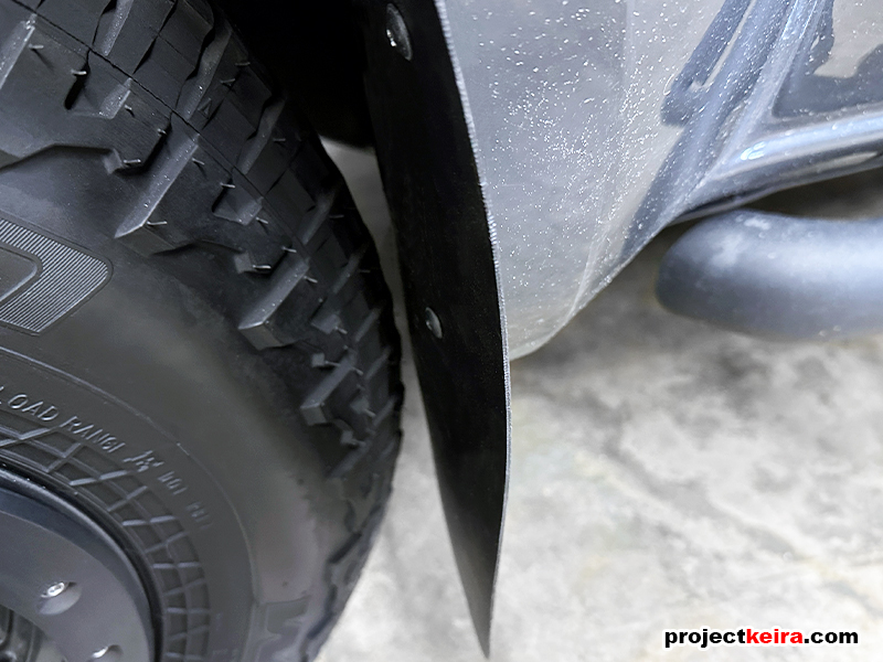 And here is how the new Rally Armor flap looks installed up front; you can see the tire clearance in the photo (and that I need to wash my truck again):